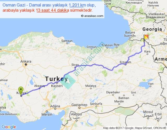 Osman Gazi - Damal arası yaklaşık olarak 90 km/h ile yukarıda belirtilen sürede olup, iki yerin kuş uçuşu uzaklığı (mesafesi) 964'dir. Eğer belirtilen yerler arasında uçak seferi var ise bu süre uçakla 1 saat 28 dakika'ya kadar düşebilir. Yolculuk otobüsle 17 saat 51 dakika sürmektedir.