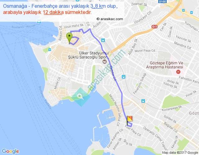 Osmanağa - Fenerbahçe arası yaklaşık olarak 90 km/h ile yukarıda belirtilen sürede olup, iki yerin kuş uçuşu uzaklığı (mesafesi) 2'dir. Yolculuk otobüsle 15 dakika sürmektedir.