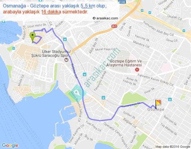 Osmanağa - Göztepe arası yaklaşık olarak 90 km/h ile yukarıda belirtilen sürede olup, iki yerin kuş uçuşu uzaklığı (mesafesi) 3'dir. Yolculuk otobüsle 20 dakika sürmektedir.