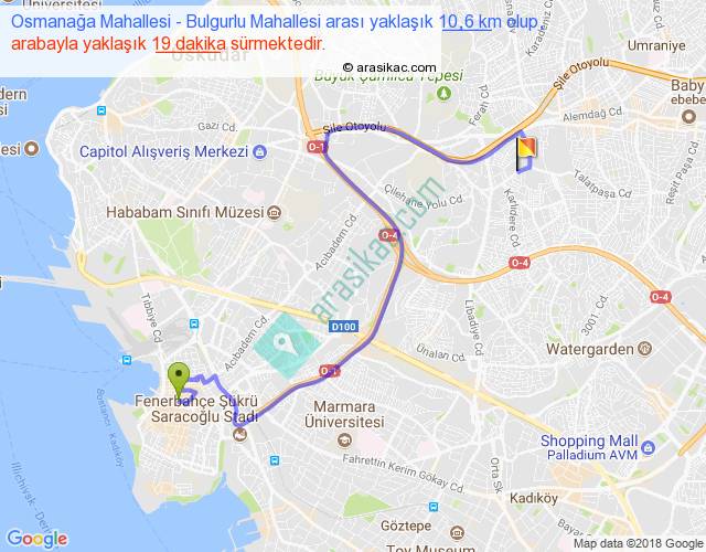 Osmanağa Mahallesi - Bulgurlu Mahallesi arası yaklaşık olarak 90 km/h ile yukarıda belirtilen sürede olup, iki yerin kuş uçuşu uzaklığı (mesafesi) 5'dir. Yolculuk otobüsle 24 dakika sürmektedir.