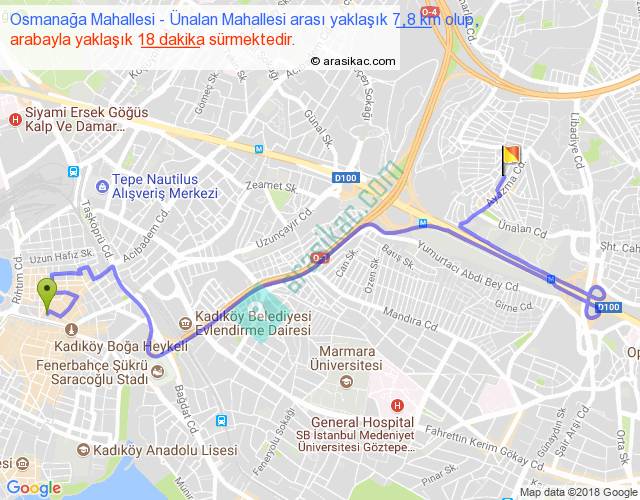 Osmanağa Mahallesi - Ünalan Mahallesi arası yaklaşık olarak 90 km/h ile yukarıda belirtilen sürede olup, iki yerin kuş uçuşu uzaklığı (mesafesi) 3'dir. Yolculuk otobüsle 23 dakika sürmektedir.