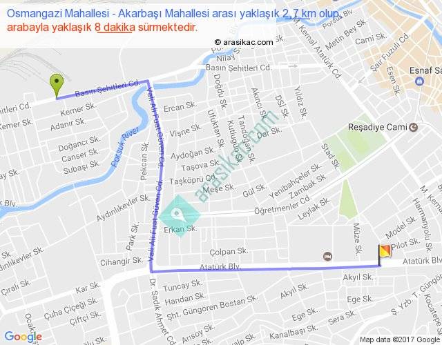 Osmangazi Mahallesi - Akarbaşı Mahallesi arası yaklaşık olarak 90 km/h ile yukarıda belirtilen sürede olup, iki yerin kuş uçuşu uzaklığı (mesafesi) 2'dir. Yolculuk otobüsle 10 dakika sürmektedir.