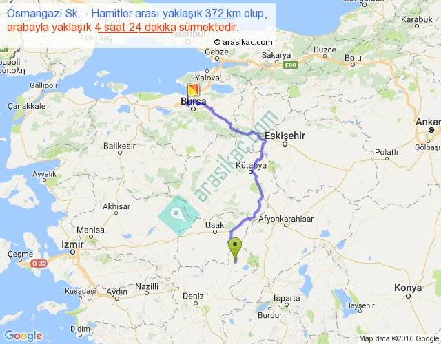 Osmangazi Sk. - Hamitler arası yaklaşık olarak 90 km/h ile yukarıda belirtilen sürede olup, iki yerin kuş uçuşu uzaklığı (mesafesi) 224'dir. Yolculuk otobüsle 5 saat 43 dakika sürmektedir.
