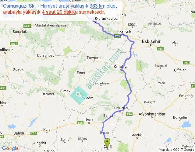 Osmangazi Sk. - Hürriyet arası yaklaşık olarak 90 km/h ile yukarıda belirtilen sürede olup, iki yerin kuş uçuşu uzaklığı (mesafesi) 221'dir. Yolculuk otobüsle 5 saat 38 dakika sürmektedir.
