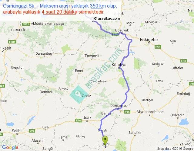 Osmangazi Sk. - Maksem arası yaklaşık olarak 90 km/h ile yukarıda belirtilen sürede olup, iki yerin kuş uçuşu uzaklığı (mesafesi) 215'dir. Yolculuk otobüsle 5 saat 38 dakika sürmektedir.