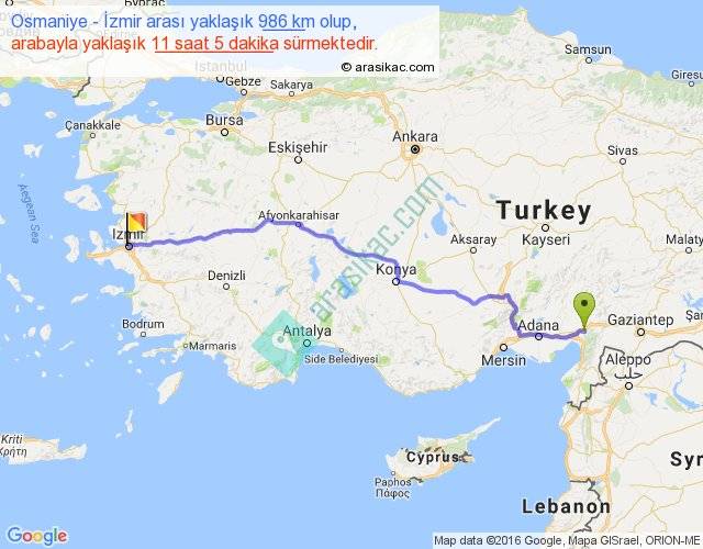 Osmaniye - İzmir arası yaklaşık olarak 90 km/h ile yukarıda belirtilen sürede olup, iki yerin kuş uçuşu uzaklığı (mesafesi) 809'dir. Eğer belirtilen yerler arasında uçak seferi var ise bu süre uçakla 1 saat 14 dakika'ya kadar düşebilir. Yolculuk otobüsle 14 saat 24 dakika sürmektedir.