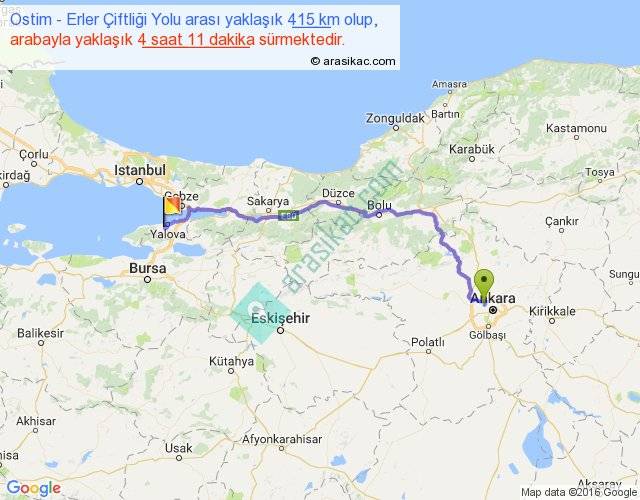Ostim - Erler Çiftliği Yolu arası yaklaşık olarak 90 km/h ile yukarıda belirtilen sürede olup, iki yerin kuş uçuşu uzaklığı (mesafesi) 304'dir. Eğer belirtilen yerler arasında uçak seferi var ise bu süre uçakla 28 dakika'ya kadar düşebilir. Yolculuk otobüsle 5 saat 26 dakika sürmektedir.