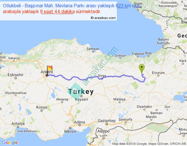 Otlukbeli - Başpınar Mah. Mevlana Parkı arası yaklaşık olarak 90 km/h ile yukarıda belirtilen sürede olup, iki yerin kuş uçuşu uzaklığı (mesafesi) 601'dir. Eğer belirtilen yerler arasında uçak seferi var ise bu süre uçakla 55 dakika'ya kadar düşebilir. Yolculuk otobüsle 12 saat 39 dakika sürmektedir.
