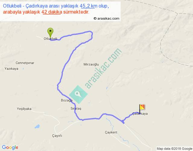 Otlukbeli - Çadırkaya arası yaklaşık olarak 90 km/h ile yukarıda belirtilen sürede olup, iki yerin kuş uçuşu uzaklığı (mesafesi) 23'dir. Yolculuk otobüsle 54 dakika sürmektedir.
