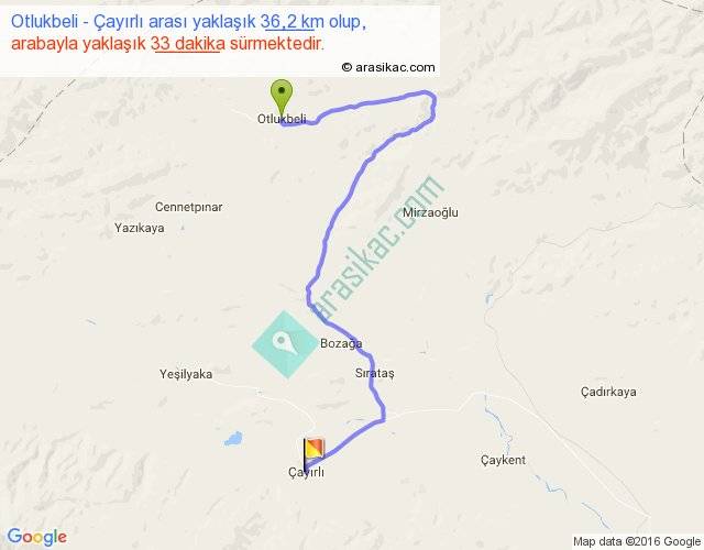 Otlukbeli - Çayırlı arası yaklaşık olarak 90 km/h ile yukarıda belirtilen sürede olup, iki yerin kuş uçuşu uzaklığı (mesafesi) 19'dir. Yolculuk otobüsle 42 dakika sürmektedir.