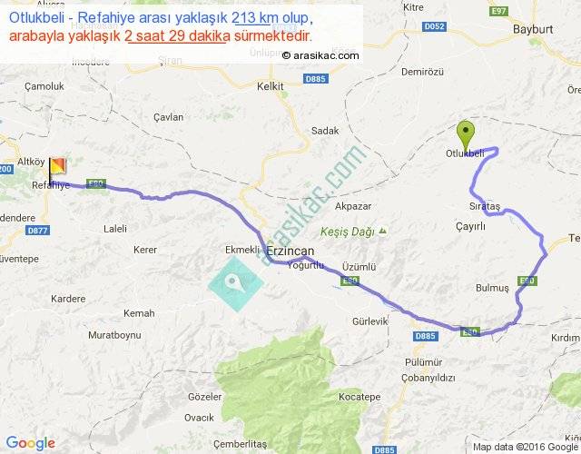 Otlukbeli - Refahiye arası yaklaşık olarak 90 km/h ile yukarıda belirtilen sürede olup, iki yerin kuş uçuşu uzaklığı (mesafesi) 107'dir. Yolculuk otobüsle 3 saat 13 dakika sürmektedir.