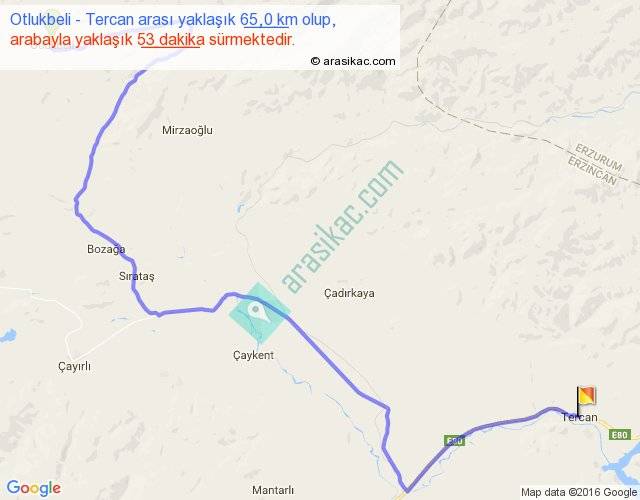 Otlukbeli - Tercan arası yaklaşık olarak 90 km/h ile yukarıda belirtilen sürede olup, iki yerin kuş uçuşu uzaklığı (mesafesi) 38'dir. Yolculuk otobüsle 1 saat 8 dakika sürmektedir.
