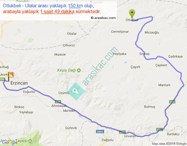 Otlukbeli - Ulalar arası yaklaşık olarak 90 km/h ile yukarıda belirtilen sürede olup, iki yerin kuş uçuşu uzaklığı (mesafesi) 55'dir. Yolculuk otobüsle 2 saat 21 dakika sürmektedir.