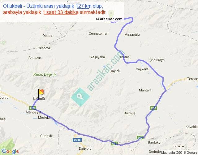 Otlukbeli - Üzümlü arası yaklaşık olarak 90 km/h ile yukarıda belirtilen sürede olup, iki yerin kuş uçuşu uzaklığı (mesafesi) 40'dir. Yolculuk otobüsle 2 saat 0 dakika sürmektedir.