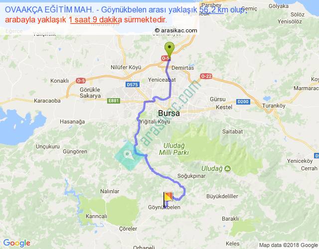 OVAAKÇA EĞİTİM MAH. - Göynükbelen arası yaklaşık olarak 90 km/h ile yukarıda belirtilen sürede olup, iki yerin kuş uçuşu uzaklığı (mesafesi) 34'dir. Yolculuk otobüsle 1 saat 29 dakika sürmektedir.