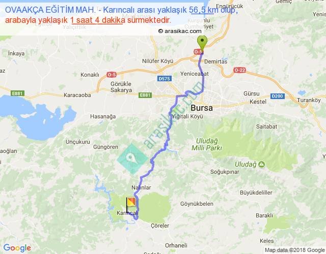 OVAAKÇA EĞİTİM MAH. - Karıncalı arası yaklaşık olarak 90 km/h ile yukarıda belirtilen sürede olup, iki yerin kuş uçuşu uzaklığı (mesafesi) 40'dir. Yolculuk otobüsle 1 saat 23 dakika sürmektedir.