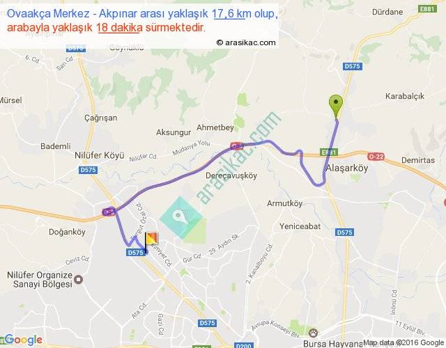Ovaakça Merkez - Akpınar arası yaklaşık olarak 90 km/h ile yukarıda belirtilen sürede olup, iki yerin kuş uçuşu uzaklığı (mesafesi) 10'dir. Yolculuk otobüsle 23 dakika sürmektedir.