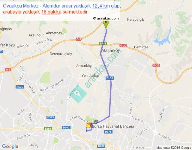 Ovaakça Merkez - Alemdar arası yaklaşık olarak 90 km/h ile yukarıda belirtilen sürede olup, iki yerin kuş uçuşu uzaklığı (mesafesi) 10'dir. Yolculuk otobüsle 23 dakika sürmektedir.