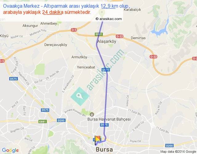 Ovaakça Merkez - Altıparmak arası yaklaşık olarak 90 km/h ile yukarıda belirtilen sürede olup, iki yerin kuş uçuşu uzaklığı (mesafesi) 12'dir. Yolculuk otobüsle 31 dakika sürmektedir.