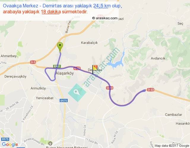 Ovaakça Merkez - Demirtas arası yaklaşık olarak 90 km/h ile yukarıda belirtilen sürede olup, iki yerin kuş uçuşu uzaklığı (mesafesi) 4'dir. Yolculuk otobüsle 23 dakika sürmektedir.