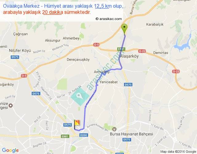 Ovaakça Merkez - Hürriyet arası yaklaşık olarak 90 km/h ile yukarıda belirtilen sürede olup, iki yerin kuş uçuşu uzaklığı (mesafesi) 10'dir. Yolculuk otobüsle 26 dakika sürmektedir.