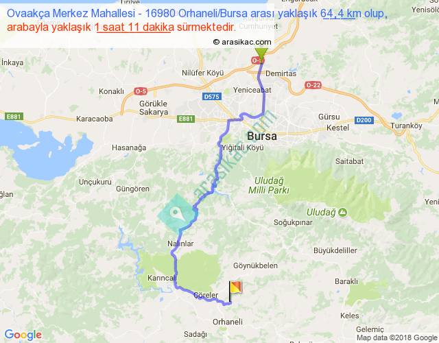 Ovaakça Merkez Mahallesi - 16980 Orhaneli Bursa arası yaklaşık olarak 90 km/h ile yukarıda belirtilen sürede olup, iki yerin kuş uçuşu uzaklığı (mesafesi) 41'dir. Yolculuk otobüsle 1 saat 32 dakika sürmektedir.