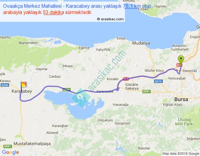 Ovaakça Merkez Mahallesi - Karacabey arası yaklaşık olarak 90 km/h ile yukarıda belirtilen sürede olup, iki yerin kuş uçuşu uzaklığı (mesafesi) 60'dir. Yolculuk otobüsle 1 saat 8 dakika sürmektedir.