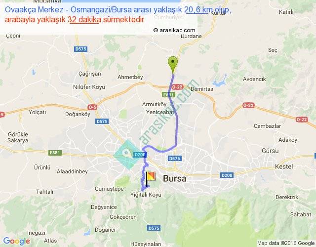 Ovaakça Merkez - Osmangazi Bursa arası yaklaşık olarak 90 km/h ile yukarıda belirtilen sürede olup, iki yerin kuş uçuşu uzaklığı (mesafesi) 14'dir. Yolculuk otobüsle 41 dakika sürmektedir.