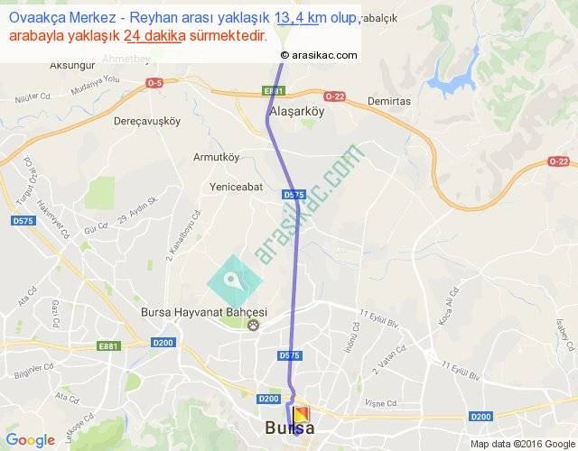 Ovaakça Merkez - Reyhan arası yaklaşık olarak 90 km/h ile yukarıda belirtilen sürede olup, iki yerin kuş uçuşu uzaklığı (mesafesi) 12'dir. Yolculuk otobüsle 31 dakika sürmektedir.