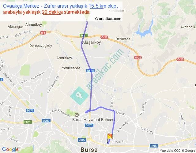 Ovaakça Merkez - Zafer arası yaklaşık olarak 90 km/h ile yukarıda belirtilen sürede olup, iki yerin kuş uçuşu uzaklığı (mesafesi) 12'dir. Yolculuk otobüsle 28 dakika sürmektedir.
