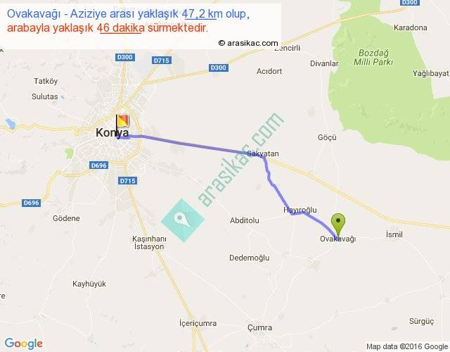 Ovakavağı - Aziziye arası yaklaşık olarak 90 km/h ile yukarıda belirtilen sürede olup, iki yerin kuş uçuşu uzaklığı (mesafesi) 42'dir. Yolculuk otobüsle 59 dakika sürmektedir.