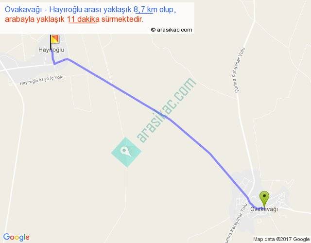 Ovakavağı - Hayıroğlu arası yaklaşık olarak 90 km/h ile yukarıda belirtilen sürede olup, iki yerin kuş uçuşu uzaklığı (mesafesi) 8'dir. Yolculuk otobüsle 14 dakika sürmektedir.
