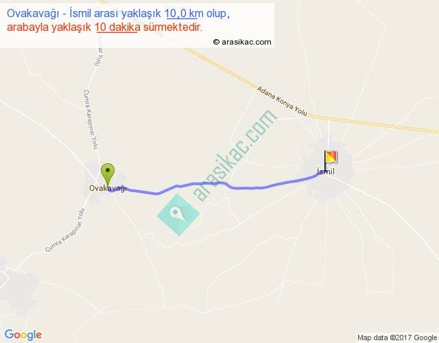 Ovakavağı - İsmil arası yaklaşık olarak 90 km/h ile yukarıda belirtilen sürede olup, iki yerin kuş uçuşu uzaklığı (mesafesi) 10'dir. Yolculuk otobüsle 13 dakika sürmektedir.