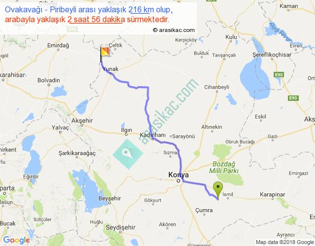 Ovakavağı - Piribeyli arası yaklaşık olarak 90 km/h ile yukarıda belirtilen sürede olup, iki yerin kuş uçuşu uzaklığı (mesafesi) 174'dir. Yolculuk otobüsle 3 saat 48 dakika sürmektedir.