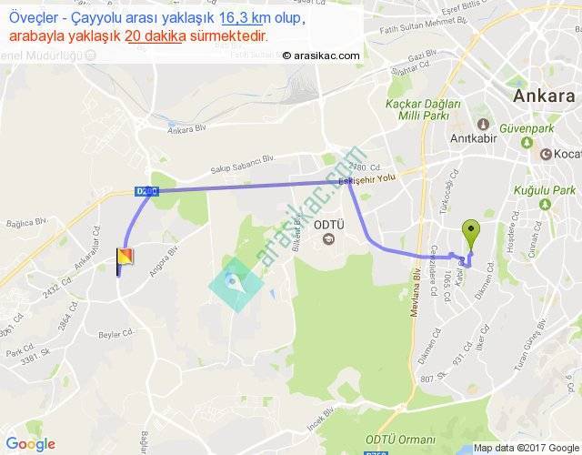Öveçler - Çayyolu arası yaklaşık olarak 90 km/h ile yukarıda belirtilen sürede olup, iki yerin kuş uçuşu uzaklığı (mesafesi) 11'dir. Yolculuk otobüsle 26 dakika sürmektedir.