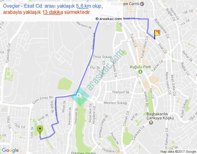 Eğer Öveçler Esat Cd. arası ne kadar yakar (benzin/mazot) diyorsanız, kilometrede 3 ₺ yakan bir aracınız var ise 15, km'de 4 ₺ yakan bir aracınız var ise 20, km'de 5 ₺ yakan bir aracınız var ise 25 ile bu yolculuğu tamamlayabilirsiniz.