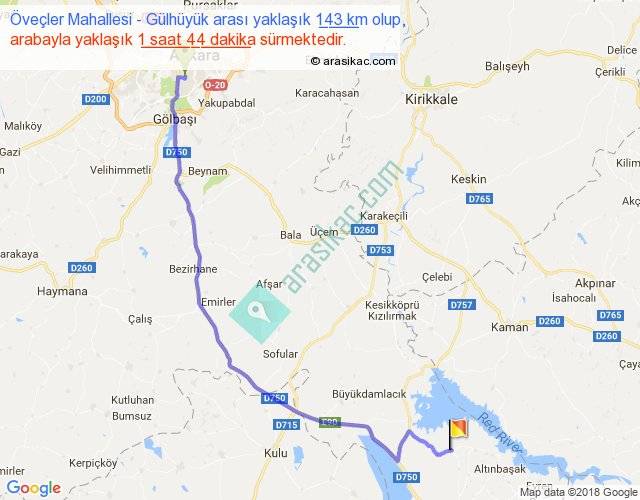 Öveçler Mahallesi - Gülhüyük arası yaklaşık olarak 90 km/h ile yukarıda belirtilen sürede olup, iki yerin kuş uçuşu uzaklığı (mesafesi) 108'dir. Yolculuk otobüsle 2 saat 15 dakika sürmektedir.