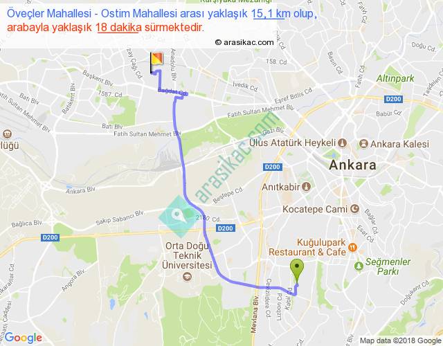 Öveçler Mahallesi - Ostim Mahallesi arası yaklaşık olarak 90 km/h ile yukarıda belirtilen sürede olup, iki yerin kuş uçuşu uzaklığı (mesafesi) 11'dir. Yolculuk otobüsle 23 dakika sürmektedir.