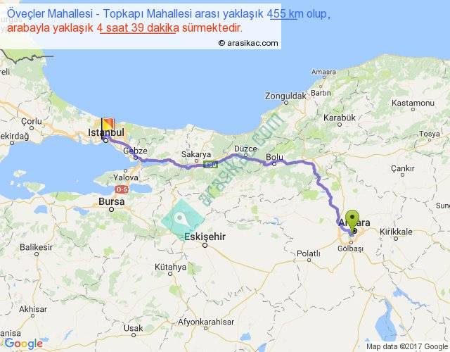 Öveçler Mahallesi - Topkapı Mahallesi arası yaklaşık olarak 90 km/h ile yukarıda belirtilen sürede olup, iki yerin kuş uçuşu uzaklığı (mesafesi) 351'dir. Eğer belirtilen yerler arasında uçak seferi var ise bu süre uçakla 32 dakika'ya kadar düşebilir. Yolculuk otobüsle 6 saat 2 dakika sürmektedir.