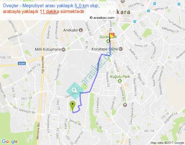 Öveçler - Meşrutiyet arası yaklaşık olarak 90 km/h ile yukarıda belirtilen sürede olup, iki yerin kuş uçuşu uzaklığı (mesafesi) 4'dir. Yolculuk otobüsle 14 dakika sürmektedir.