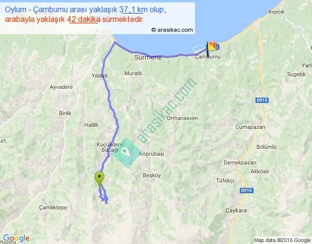 Oylum - Çamburnu arası yaklaşık olarak 90 km/h ile yukarıda belirtilen sürede olup, iki yerin kuş uçuşu uzaklığı (mesafesi) 20'dir. Yolculuk otobüsle 54 dakika sürmektedir.