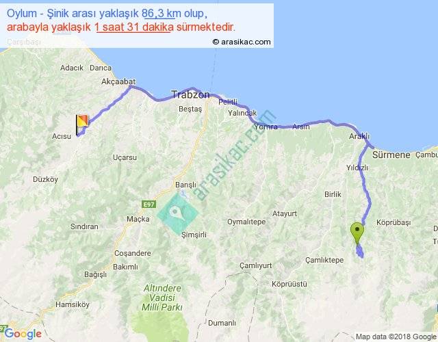 Oylum - Şinik arası yaklaşık olarak 90 km/h ile yukarıda belirtilen sürede olup, iki yerin kuş uçuşu uzaklığı (mesafesi) 50'dir. Yolculuk otobüsle 1 saat 58 dakika sürmektedir.