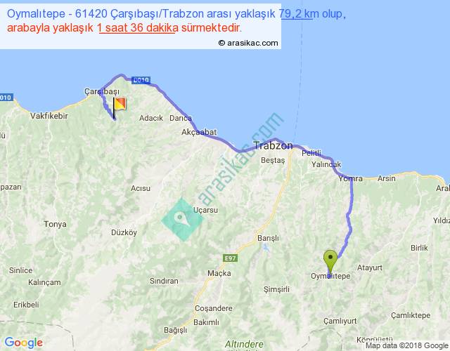 Oymalıtepe - 61420 Çarşıbaşı Trabzon arası yaklaşık olarak 90 km/h ile yukarıda belirtilen sürede olup, iki yerin kuş uçuşu uzaklığı (mesafesi) 44'dir. Yolculuk otobüsle 2 saat 4 dakika sürmektedir.
