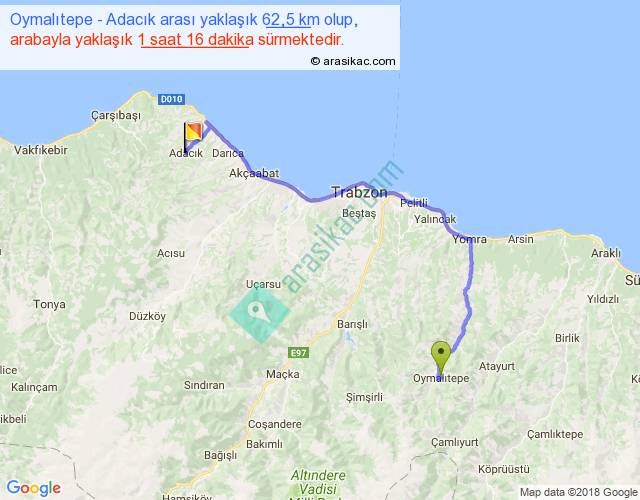 Oymalıtepe - Adacık arası yaklaşık olarak 90 km/h ile yukarıda belirtilen sürede olup, iki yerin kuş uçuşu uzaklığı (mesafesi) 39'dir. Yolculuk otobüsle 1 saat 38 dakika sürmektedir.