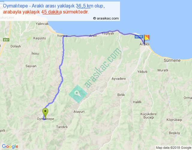 Oymalıtepe - Araklı arası yaklaşık olarak 90 km/h ile yukarıda belirtilen sürede olup, iki yerin kuş uçuşu uzaklığı (mesafesi) 24'dir. Yolculuk otobüsle 58 dakika sürmektedir.