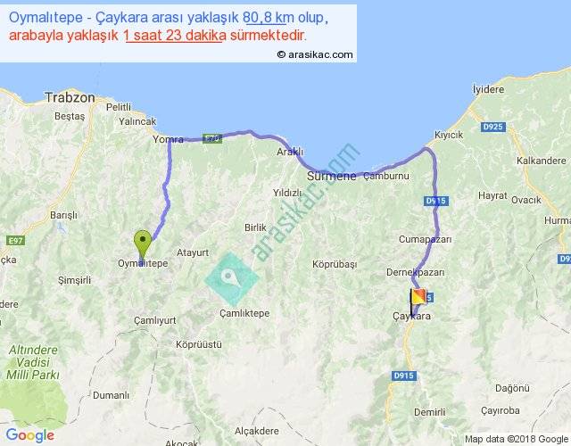 Oymalıtepe - Çaykara arası yaklaşık olarak 90 km/h ile yukarıda belirtilen sürede olup, iki yerin kuş uçuşu uzaklığı (mesafesi) 35'dir. Yolculuk otobüsle 1 saat 47 dakika sürmektedir.