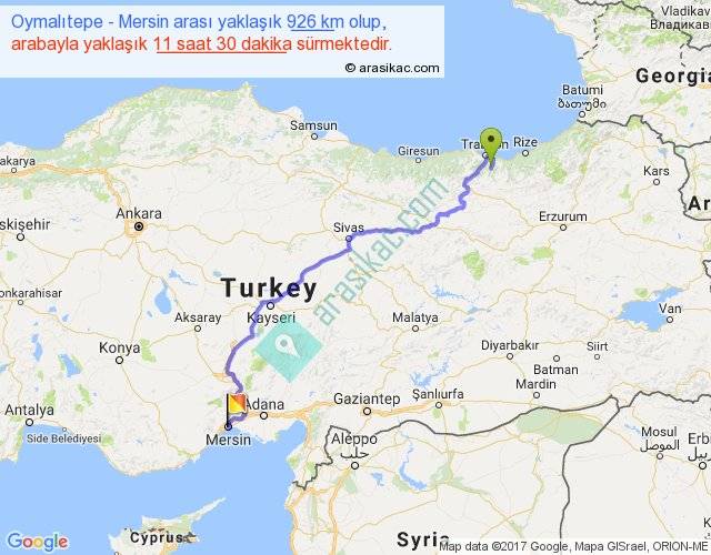 Oymalıtepe - Mersin arası yaklaşık olarak 90 km/h ile yukarıda belirtilen sürede olup, iki yerin kuş uçuşu uzaklığı (mesafesi) 628'dir. Eğer belirtilen yerler arasında uçak seferi var ise bu süre uçakla 57 dakika'ya kadar düşebilir. Yolculuk otobüsle 14 saat 57 dakika sürmektedir.