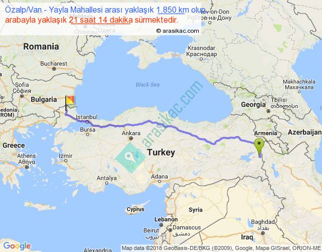 Özalp Van - Yayla Mahallesi arası yaklaşık olarak 90 km/h ile yukarıda belirtilen sürede olup, iki yerin kuş uçuşu uzaklığı (mesafesi) 1455'dir. Eğer belirtilen yerler arasında uçak seferi var ise bu süre uçakla 2 saat 14 dakika'ya kadar düşebilir. Yolculuk otobüsle 1 gün 3 saat sürmektedir.