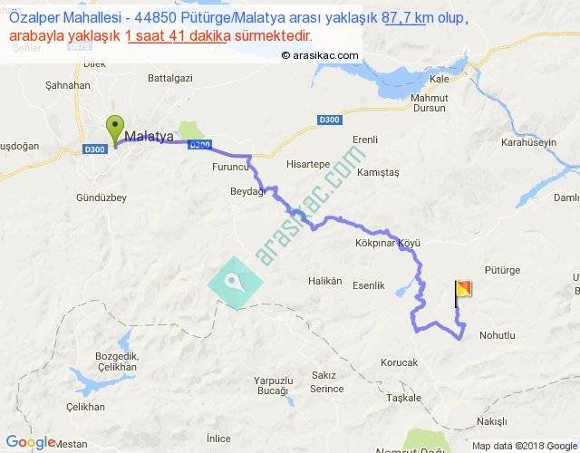 Özalper Mahallesi - 44850 Pütürge Malatya arası yaklaşık olarak 90 km/h ile yukarıda belirtilen sürede olup, iki yerin kuş uçuşu uzaklığı (mesafesi) 50'dir. Yolculuk otobüsle 2 saat 11 dakika sürmektedir.