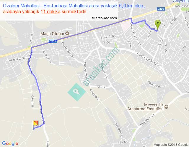 Özalper Mahallesi - Bostanbaşı Mahallesi arası yaklaşık olarak 90 km/h ile yukarıda belirtilen sürede olup, iki yerin kuş uçuşu uzaklığı (mesafesi) 4'dir. Yolculuk otobüsle 14 dakika sürmektedir.